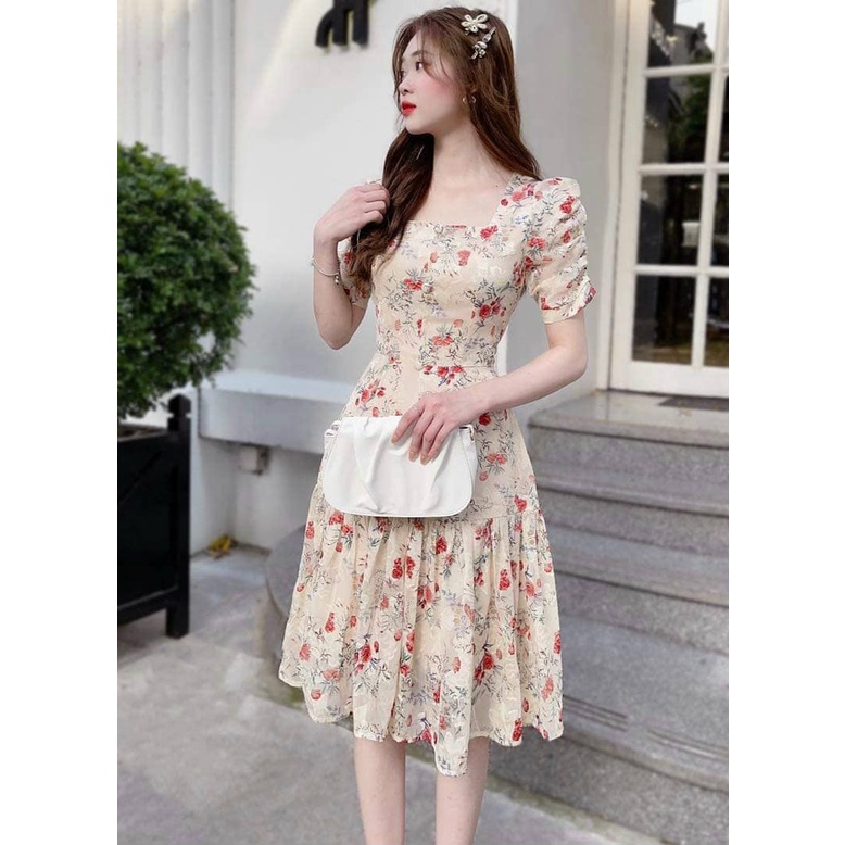 Váy hoa nhí tay bồng đuôi cá thiết kế GIIAN, đầm nữ công sở ngắn tay cổ V rút dây dáng dài G-V2156