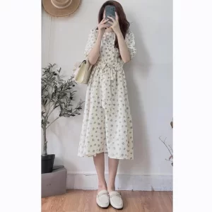 Đầm – Váy hoa nhí cổ tròn tay lỡ cúc ngực xinh xắn vintage