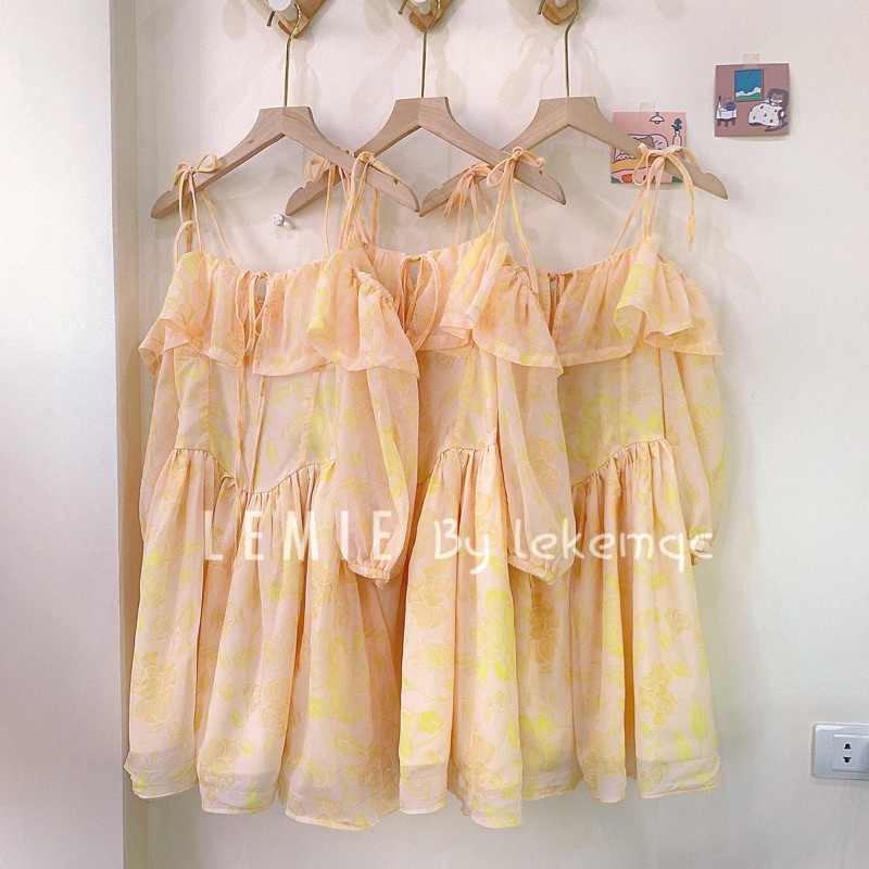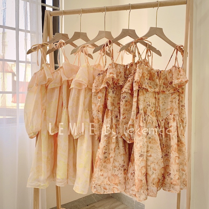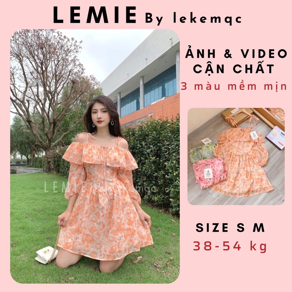 SẴN HÀNG Váy Hoa Ngắn Trễ Vai V22, Đầm Xòe Hoa Dài Tay Phong Cách Tiểu Thư Vải Voan Hoa Cam , Hoa Hồng LEMIE by lekemqc