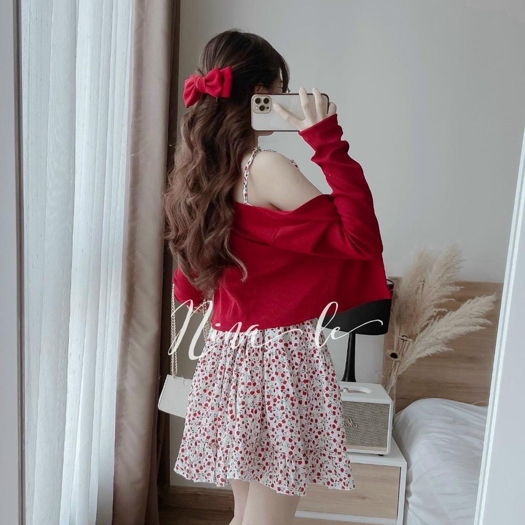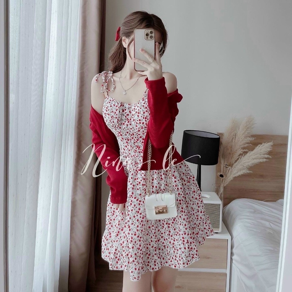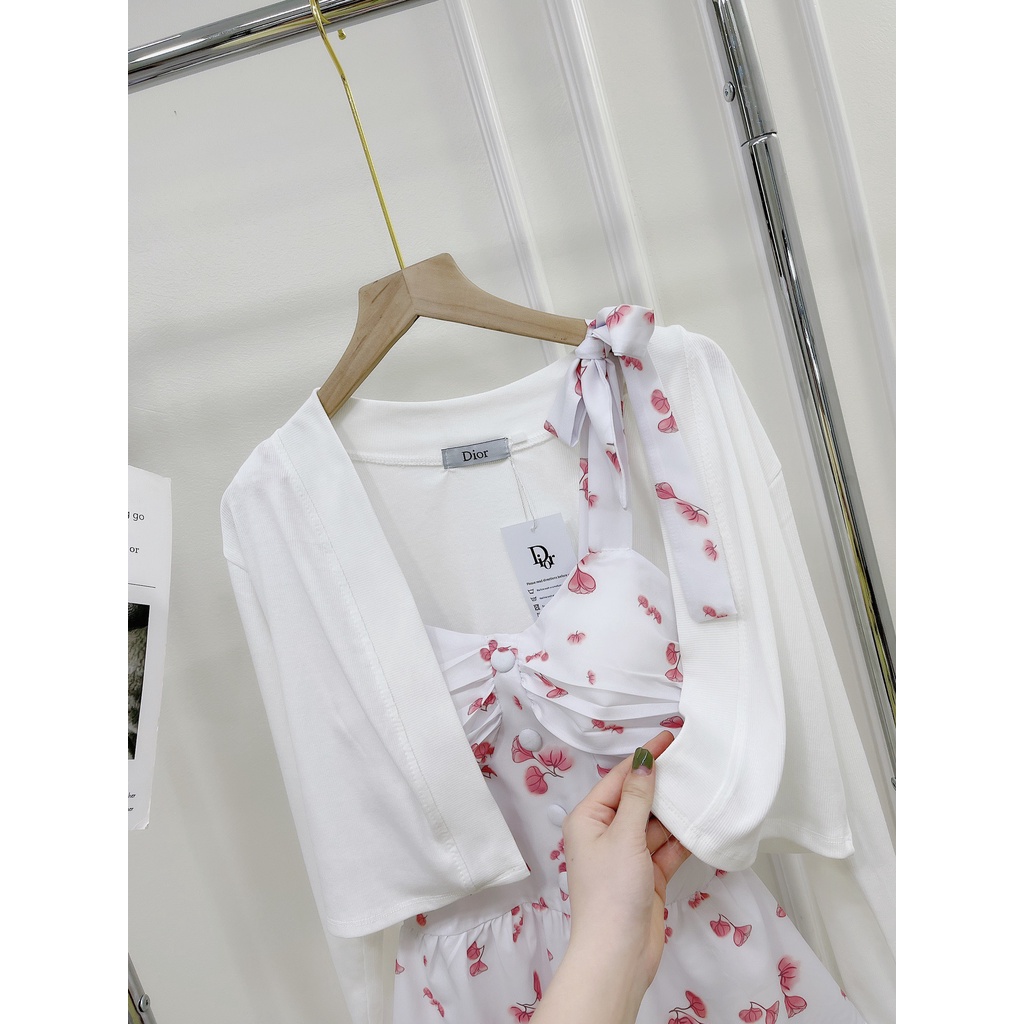Set váy 2 món váy hoa 2 dây khóa lưng kèm áo khoác thun gân, Váy 2 dây hoa xếp ly ngực siêu xinh