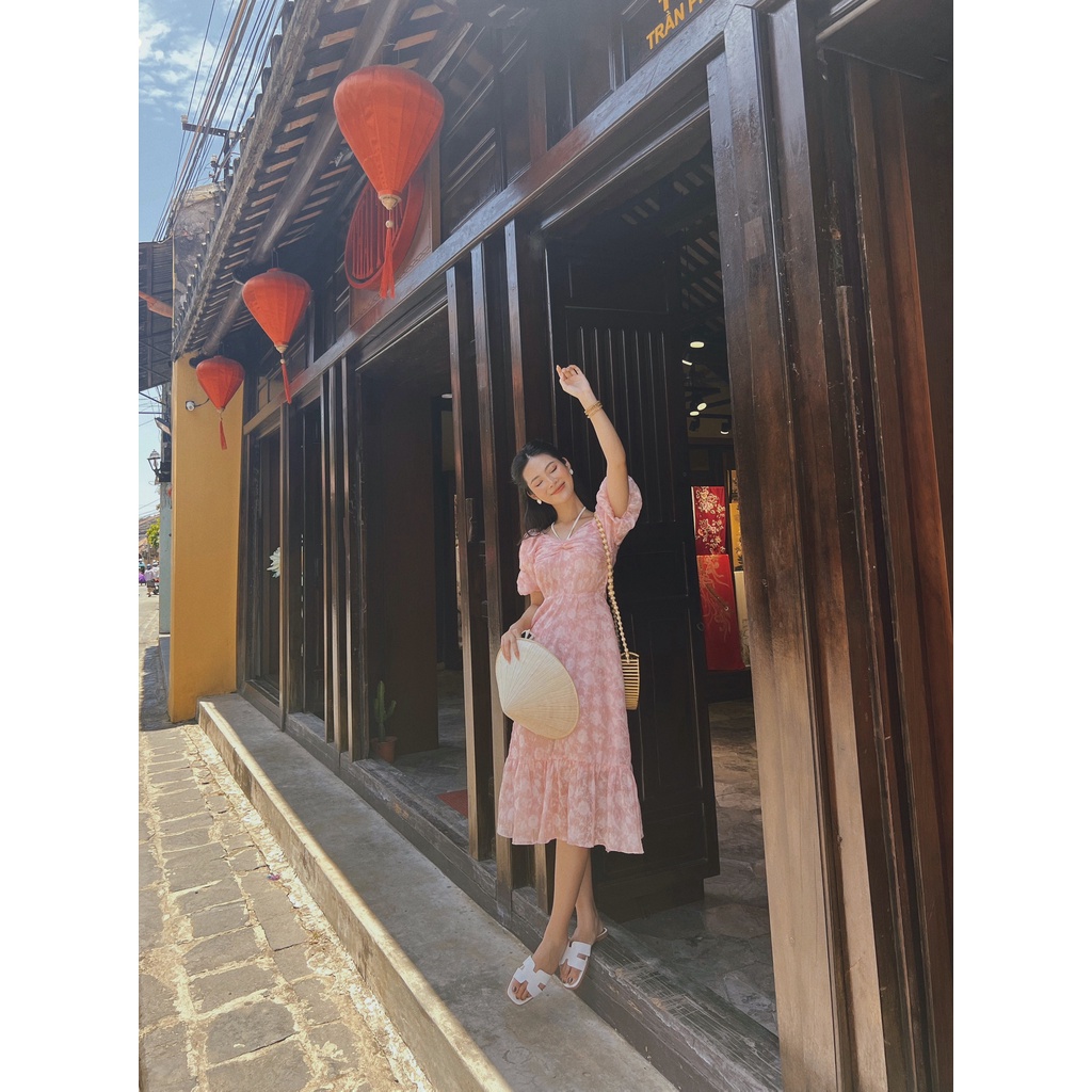 Váy đầm tơ hoa đính nổi màu hồng pastel Louise trễ vai buộc dây cổ đi du lịch đi chơi YAME