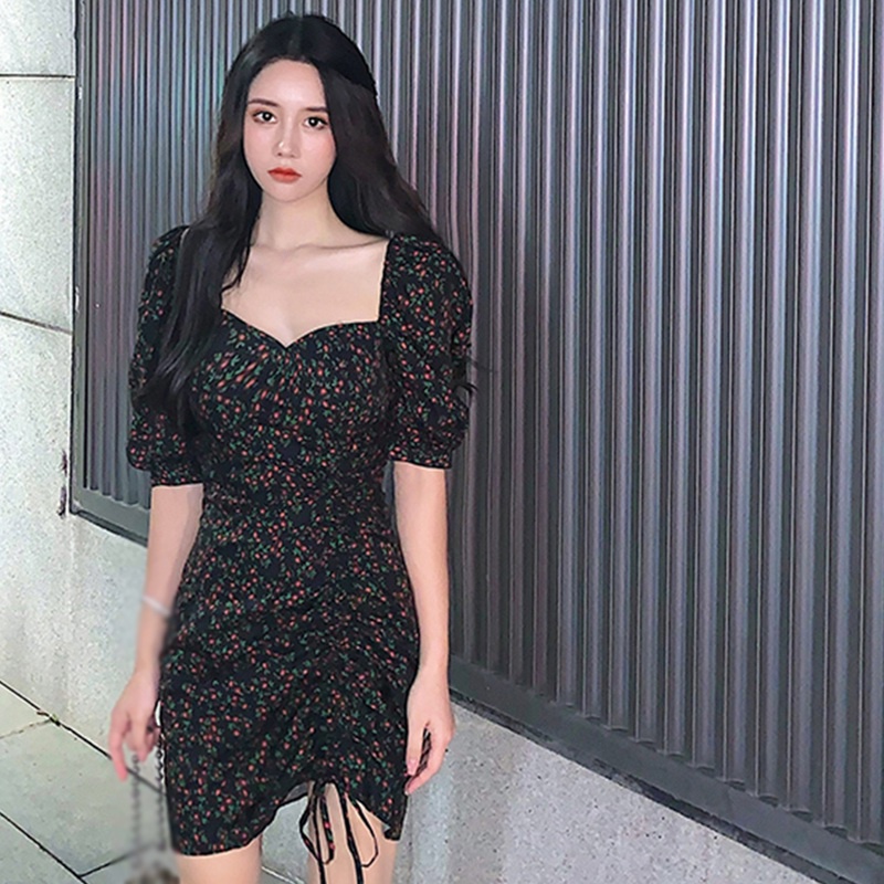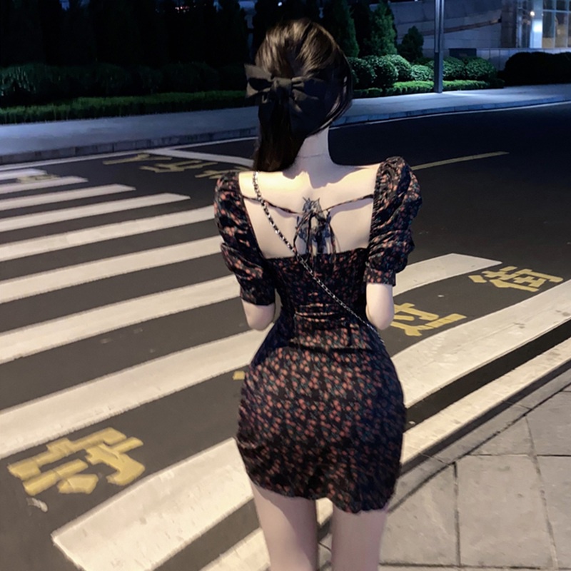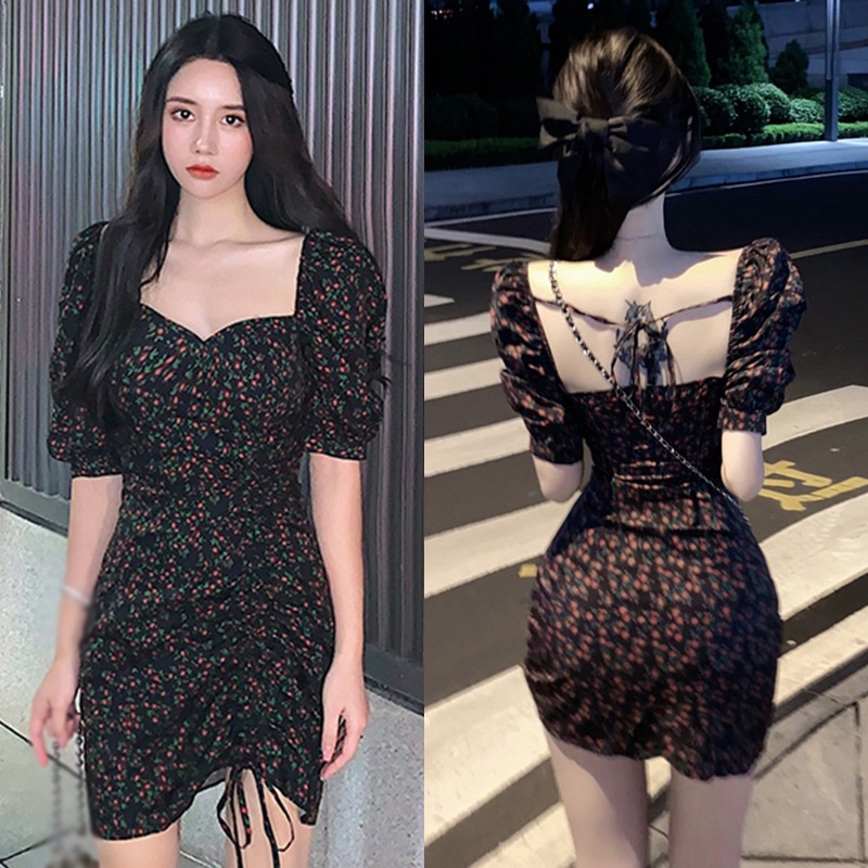 Váy dáng ôm tay ngắn cổ vuông in hoa thời trang phong cách Hàn Quốc